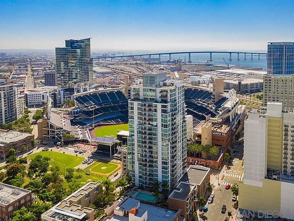 Walk through video available upon request. Fully furnished and move in ready. This unique property at Legend has an oversized L shaped patio, great for entertaining and watching the game. Luxurious wood flooring and exquisite finishings throughout. Amenities include 24/7 front desk service and security staff ; huge 7th floor deck overlooking the ballpark; community room with full kitchen; well equipped gym; pool and spa with steam and sauna. Option bedroom 2 is a convented den. The Legend is the only residential high-rise to be built inside the gates of our Major League Ballpark and the only residential tower to be built on the 3 acre Park at the Park! In a competitive market, it is more important then ever to own truly unique real estate. If your clients are looking for sustainable and inherent value real estate they can do know better that The Legend. The Legend is an amenity rich community including: Concierge service, 24 security guard services at the parking entrance, pool, steam, sauna, hot tub, fitness center. Your clients will love `Club Legend` located on the 7th floor, complete with a huge roof deck overlooking Petco Park and an outdoor fireplace lounge.