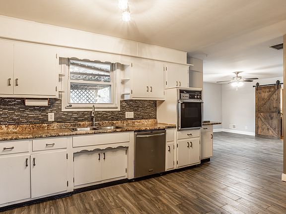 This is a wonderful all brick ranch with 4 bedrooms and 2 full baths, a fenced in rear yard on almost one-half acre lot with mature trees in a lovely neighborhood. Storage shed in rear. Original hardwood floors in the bedrooms and vinyl plank flooring throughout the other living areas. The living room, kitchen and dining combo has a wonderful feel of open space for family and entertainment activities. Stainless appliances and a breakfast bar update the kitchen which has a gas stove as well as an extra built-in oven. Dining room has a gas log fireplace and could have multiple uses. Two car attached garage.