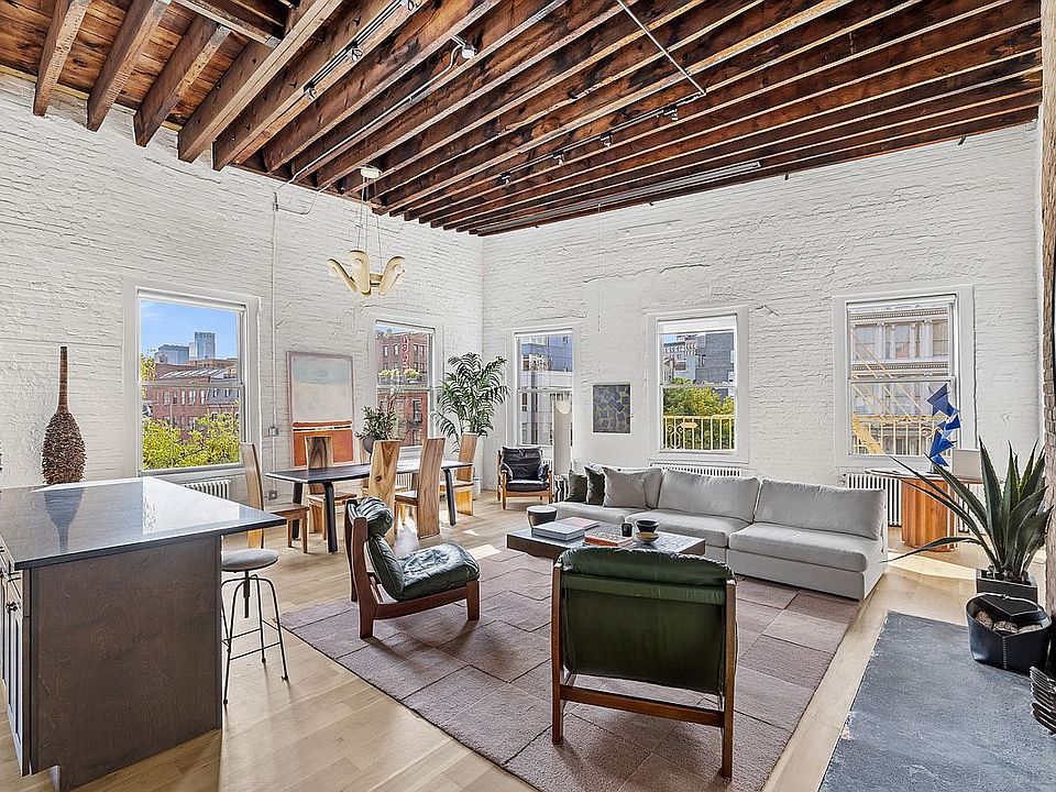Step into the massive corner great room and take in 15-foot exposed beam ceilings, walls of brick, wide-plank hardwood floors, and dramatic natural light streaming through skylights and oversized windows. A wood-burning fireplace anchors the living space, while open views of treetops, Bond Street, and the downtown skyline elevate the everyday.