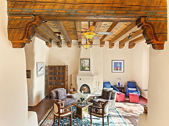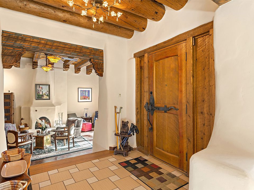 Tucked in the foothills down a private branch of prestigious Brownell Howland Road, this impressively expansive four-bedroom estate is a unique hideaway offering a rare combination of vintage Santa Fe style, meticulous detailing, welcoming warmth, and modern conveniences. A grand living room, formal and casual dining spaces, a charming cook’s kitchen, a handsome library or media room, and peaceful private quarters feature eye-catching carved and painted ceiling beams, vigas, posts, and corbels; other ornamental woodwork; latillas; deep archways; brick, tile, and hardwood floors; nichos; bancos; and distinctive ironwork in intricate Southwestern-themed patterns. A sunny office or in-law suite with a wet bar, fireplace, and bath enjoys the privacy of its own wing. The owner’s suite is a quiet aerie perched above a sunny atrium where plants and an in-ground tree flourish; it includes a spacious carpeted bedroom with mountain views, a balcony, a multi-bay walk-in closet, and a spa-like bath with a roomy shower, a soaking tub, a cedar closet, and two separate vanities. Separating the main residence from a wonderfully generous attached guesthouse with its own garage is a voluminous party room with a bath, a kitchen area, and doors to a portal and courtyard patio. The guest quarters are filled with glorious light and views from multiple oversized windows. Quiet and secluded, the gated acreage features a garden, outdoor living and dining spaces, mature trees, and sweeping views.