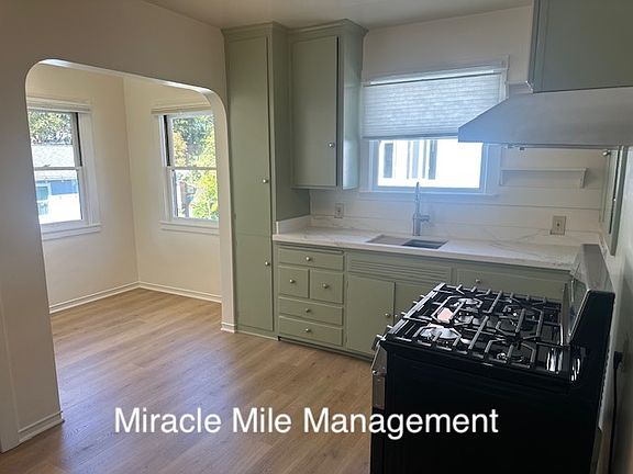 Modern kitchen with new countertops, new flooring, freshly painted green cabinets, stainless steel gas stove, French-door refrigerator, stainless range hood, new stainless sink, and Moen faucet.