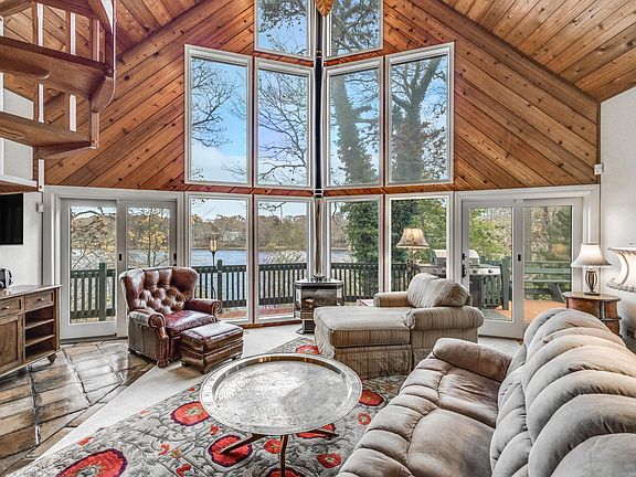 Welcome to this stunning contemporary waterfront home on Fresh Pond in East Falmouth! This property offers breathtaking views and a private sandy beach right on the pond. Enjoy outdoor living at its finest with a wrap-around deck perfect for entertaining, beautifully designed exterior landscape lighting, and an elegant electrical waterfall koi pond. The home also features a spacious two-car garage, two driveways, and the convenience of a home alarm system. Surprisingly spacious and with great storage even with the soaring ceilings. Enjoy the waterviews and sweet breezes off the water all year round. Inside, you'll find three bedrooms, two baths, and a Title 5 certified septic system. The 11-zone irrigation system ensures the lush landscaping stays vibrant. This is the perfect retreat for those seeking both luxury and tranquility on the water. Buyers and buyers agents to validate all information herein.