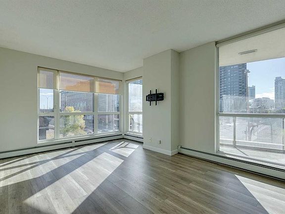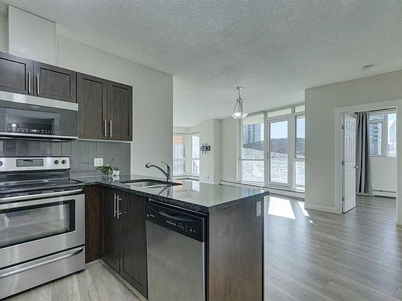 Welcome to a fantastic 2-bed, 2-bath + Den at Riverfront Pointe that actually gets how you want to live. Located in the vibrant East Village, this unit is all about space, smart design, and spontaneous adventure. With over 900 SF, this isn't your average condo box. The bedrooms are placed on opposite sides of the unit—perfect for actual privacy, whether you have a roommate, a partner, or just like your quiet space. Plus, you get an additional area that's ready to handle your home office, Peloton, or whatever passion project you’re currently obsessed with. The entire unit features newer laminate flooring with NO carpet for a modern look and easy cleaning. The central kitchen with its granite counters and updated appliances is perfectly set up for that quick bite before you hit the river path or hosting friends before going to the flames game or a concert. 9' ceilings and more windows than walls in the living room keep things bright and open. Step outside and you're instantly connected to the Bow River pathways, Studio Bell, the Central Library, and all the best spots in East Village. Don't forget about the Saddledome and the NEW arena and entertainment district that is already underway. C train, Art Commons, Prince's Island and soo many other places to mention, means you can walk almost everywhere, but don't worry about your car feeling neglected. This unit comes with TWO titled parking spots that are secure and heated. You've also got a gym, concierge and 24hr security. Combine all this with immediate possession available, this unit is easy to show and ready to go!