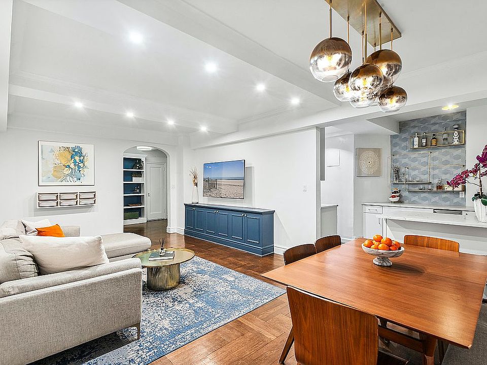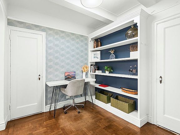 Spacious, renovated and pin-drop quiet pre-war true two bedroom, two bathroom (convertible three bedroom) plus home office measuring approximately 1,240 square feet in the heart of the Upper East Side. The generous gallery entrance creates the perfect mud room separation from the home as you enter to the uniquely large and versatile formal foyer with Phillip Jeffries wallpaper, two spacious closets, chic custom built-ins that can serve your needs as a home office, play area or sitting room. The large living room provides a comfortable balance of living and dining areas outfitted with a beautiful archway, beamed ceilings, custom high-hat lighting and custom built-ins ideal for entertaining, relaxing or room for a play area.