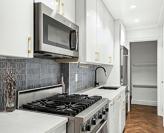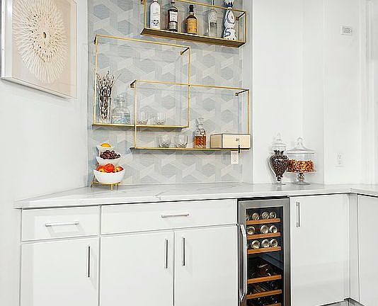 The renovated and stylish kitchen was updated with the contemporary chef in mind. Prepare savory meals to your heart's content with high-end stainless steel appliances including Viking stove and fridge, quartz countertops, bronze hardware, and pantry. Entertain easily in your attractive windowed dry bar alcove featuring a wine fridge and breakfast countertop accommodating bar stools for quick meals. Alternatively, convert the kitchen alcove to your third bedroom or home office.