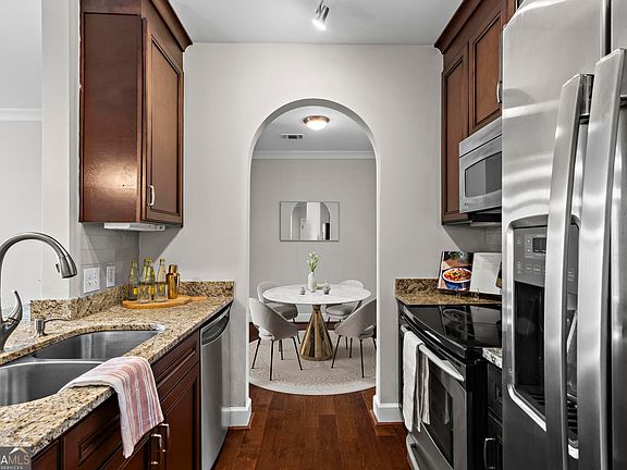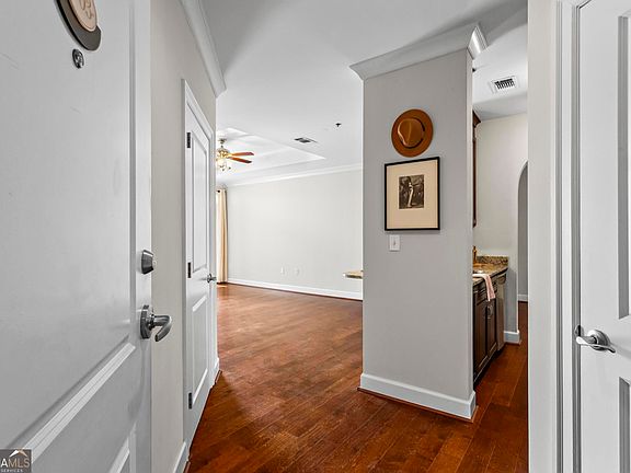 Discover the perfect blend of city energy and everyday comfort at the desirable Paces 325 condominium complex! This complex offers a secure, safe environment with numerous luxurious amenities include a 24-hour concierge, private parking, storage units, in ground pool & entertaining grill area, a fitness center, and modern clubhouse with plenty to enjoy! Step into your new home with one of the largest 1-bedroom, 1-bathroom floor plans in the building that is move-in ready featuring fresh paint, rich hardwood floors, and thoughtful upgrades throughout! The open-concept floor plan with trayed ceilings, crown moulding, and natural light beaming in from the floor to ceiling sliding doors to the private patio makes for a cozy and spacious environment to retreat to from the active lifestyle in the city! This dream kitchen features stained modern cabinets, a custom extended breakfast bar with upgraded granite, and stainless steel appliances with a direct view to the living room & patio. You'll love the flex space unique to this floor plan that could serve as a dining room, office, etc. offering that extra needed space that really opens up the home! The oversized primary bedroom with a trayed ceiling is filled with natural light and equipped with a walk-in closet! Step into the luxurious full bathroom updated with a large vanity, granite countertops, HEATED ceramic tile flooring, and a modern walk-in shower. The home also features a private rear patio with views to the city for the perfect place to unwind with some fresh air. This unit also comes with a private parking permit and climate-controlled storage unit! Outside of the condo, the real bonus is being steps away from everything that Buckhead has to offer including top-rated restaurants, shopping, coffee shops, nightlife - you name it!. The perfect lifestyle in the city with the convenient retreat to your home is unmatched and ready for you to call home!