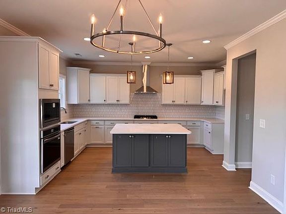 Bonus roomWhite picket-style tile backsplashCrown mouldingUpgraded tray ceilingTile showerBright kitchenOpen floor plan