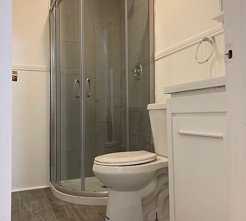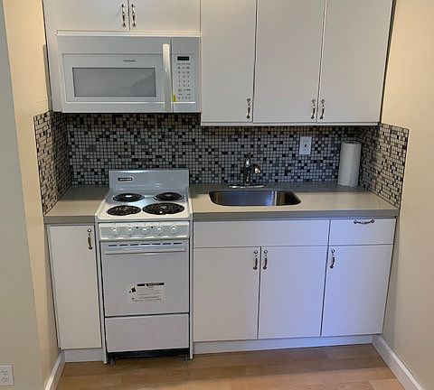 Apartment has hardwood floors and appliances. Central living space has kitchen with electric stove and microwave in nook; refrigerator is across the room in a corner. Main living space and bedroom both have a window.