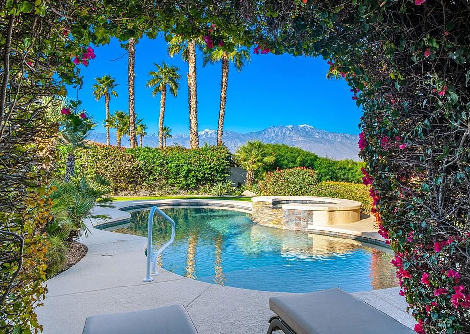 Stunning Mountain and Golf Course Views with Amazing Outdoor Living Spaces and Popular Floorplan. Enter through a gated and tiled courtyard with outdoor living space to dramatic Entry Hall. Formal Living and Dining with 14' Ceilings and an Open Kitchen and Great Room with Spectacular Mountain Views. Gourmet Chef's Kitchen features stainless appliances and granite countertops, travertine backsplash and Island with Breakfast Bar. Great Room features a fireplace and those dead on views of Mt. San Jacinto. Primary Bedroom Suite includes a retreat area, cozy fireplace and a marble filled spa bath with double walk-in closets. 2 guest bedrooms with ensuite baths or optional Office. Updated Powder Room. Outside is a covered outdoor living area, swimmer's waterfall pool, spa, fire pit, built-in BBQ island and multiple terraces with custom landscaping all surrounded by views of Mt. San Jacinto and Mt. San Gorgonio and Gary Player Course views. Legacy ownership includes Mission Hills Country Club social/fitness membership. Furnishings Negotiable - could be turnkey and ready to enjoy for the season. Come home to your Desert Oasis!