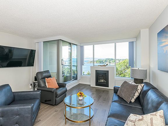 Stunning Southwest Ocean Views! Turnkey, updated and FULLY FURNISHED. This sunny corner condo is ready for you to enjoy breathtaking views of the ocean, harbor, and Olympic Mountains through its panoramic windows. Watch cruise ships, seaplanes, kayakers, and beautiful sunsets every day of the year. This two-bed unit is tastefully furnished with high-quality furniture purchased new just a few years ago. Engineered hardwood flooring, modern kitchen and a cozy gas fireplace create a welcoming ambiance. Sea West Quay is a steel-and-concrete building with a proactive strata. Amenities include secure underground parking, storage, fitness room, workshop, carwash station and rec rooms. Located just steps from the scenic Songhees waterfront walkway, E&N Trail, parks, shops, restaurants and minutes from downtown Victoria, this is the ideal blend of tranquility and convenience. Come and see how you could enjoy a vibrant Island lifestyle! Ready for immediate possession.