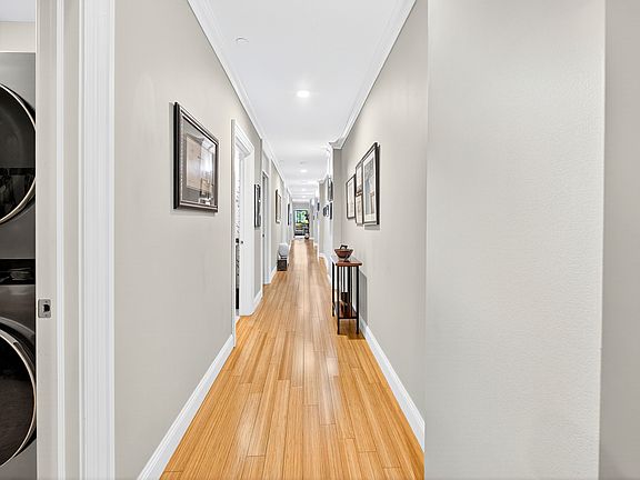 Natural bamboo flooring, a step-up living room, and countless custom upgrades further elevate the home, while thoughtful touches such as eleven closets and a full laundry room complete with sink, cabinetry, and easy-care flooring ensure both luxury and livability. The gourmet kitchen is equally impressive, offering premium appliances, bespoke finishes, and a design tailored for both culinary creativity and sophisticated entertaining.