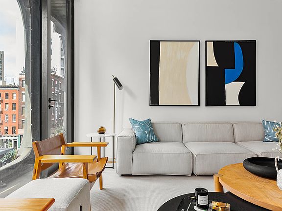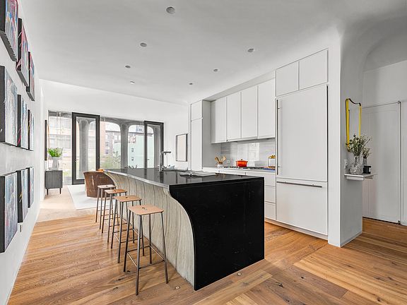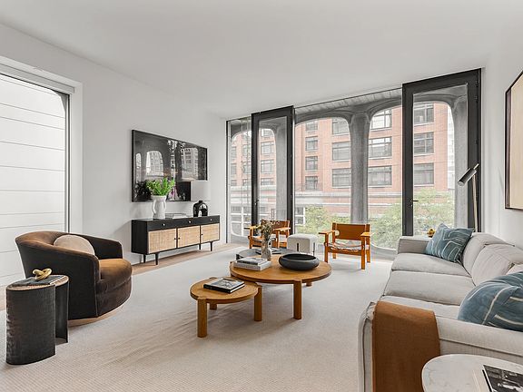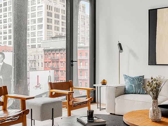 With western exposures from every room, Residence 4S is an open, two-bedroom, two-and-a-half bathroom condo with floor-to-ceiling windows, pristine finishes, and boutique services. Perched above West Broadway in the distinctive XOCO 325 condominium, this 1,555 square foot home is a private enclave set in the center of one of New York's most vital neighborhoods. Residence 4S offers understated luxury in every room. The whole apartment has Austrian white oak floors, and ceilings rise over 10 feet, allowing in sumptuous western light directly to the bedrooms and spacious living room. Two southern windows provide additional light to the eat-in kitchen and adjacent dining area. Custom finishes to the kitchen include white lacquer cabinetry, a honed Black Saint Laurent marble center island, Bianco Greciale marble countertop and backsplash, a built-in Sub-Zero wine cooler, and a full suite of Gaggenau appliances. The dining area has a domed ceiling, large enough for the most ornate or substantial light fixtures. The spacious principal suite features floor-to-ceiling windows, a five-fixture bathroom, and oversized walk-in California closet. The bathroom is outfitted with honed marble walls and flooring, a Black Saint Laurent marble top vanity, custom white oak cabinetry, a free-standing soaking tub and a separate rain shower, cove lighting, and polished chrome Dornbracht fixtures. The second bedroom has a large closet and custom en suite bathroom. The bathroom features a Duravit bathtub, and marble walls and flooring. Further apartment amenities include an in-unit washer and dryer, and a powder room. The residence comes with a storage unit and two bike racks. Since its completion in 2016, XOCO 325 has already become a prominent addition to Soho, with its cast aluminum facade that harkens back to the 19th century cast iron buildings that first defined the neighborhood. A boutique condo of only 22 residences, the building features a 24/7 doorman and concierge, a private garden, and a recently updated custom fitness center and sauna.