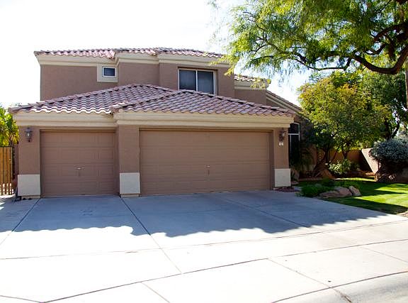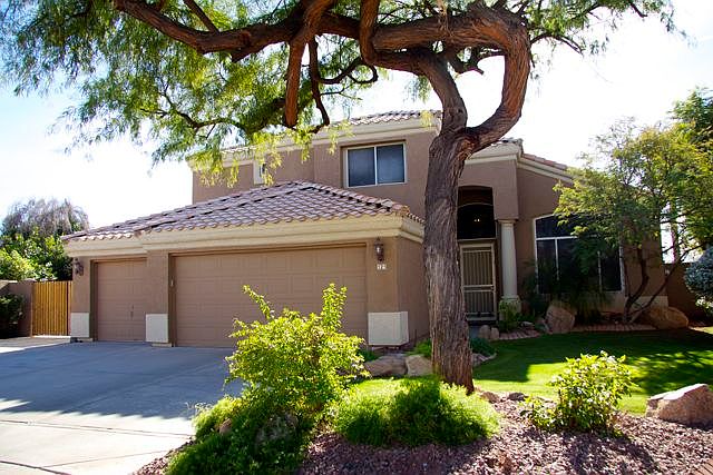 This beautifully upgraded cul de sac home is ready for entertaining. Terrific open floorplan, with 1 bedroom and 3/4 bath on the first floor. New Quartz countertops, and updated backsplash with stainless appliances in the kitchen, that flow into the cozy and welcoming family room with wood-burning fireplace. New wood plantation shutters in living room and formal dining room. Gorgeous larger lot with play pool, and professional landscaping, make this backyard one that you'll enjoy all year long. Enjoy your coffee, overlooking the nearby water, and beautiful views, on your upstairs balcony. SEER 14 A/C units. Sunscreens throughout. New garage door with key pad, ceiling fans, new lighting installed in 2013. Garage built-in cabinetry. Close to Old Town Gilbert & new LDS Temple.