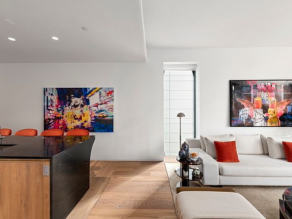 The open kitchen features white lacquer cabinetry, honed Black Saint Laurent marble center island, Bianco Greciale marble countertop and backsplash, and a full suite of Gaggenau appliances. This space flows into the large living and dining room that boast natural light from its southern and western exposures.