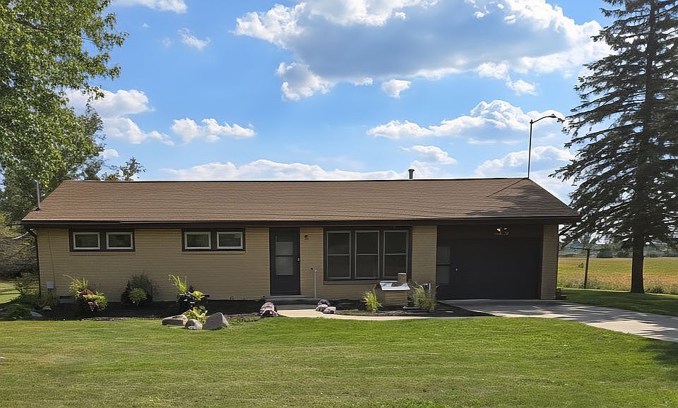 Solid brick ranch in Larkin Twp sits on 1.05 acres with 2 outbuildings and a nice-sized fruit orchard with apples, peaches, plums, pears & sweet cherries! Features include 3 bedrooms with hardwood floors, dining area with sliding glass doors, washer & dryer, newer vinyl windows, furnace & central air new in 2005, attached 1 car garage. Concrete driveway. New carpet installed in September 2025. Furnace replaced in 2023. Water heater replaced in 2017. Roof replaced in 2024. Windows replaced in 2020. City water and well. Buyer assumes Larkin Water 3 assessment.