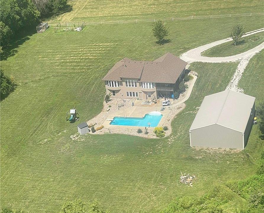 Gorgeous custom built home on 5 acres. Complete with a beautiful inground pool, garden, chicken coop and a shop with power and a car lift! Reverse Ranch with walk out basement. Each bedroom has its own bathroom. Propane fireplaces with battery backup in living room and basement. Wet bar in basement. TONS of storage. Wonderful home to entertain or enjoy your peaceful seclusion. Main floor Primary Bedroom with connected bonus room that is a great office, nursery, or guest room. Dedicated laundry room off kitchen. Walk in pantry. Covered deck, covered patio plus pool patio.