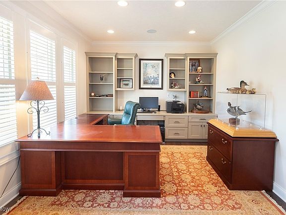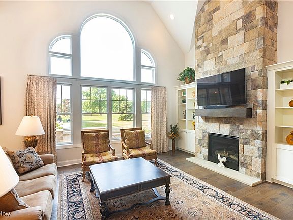 Step into the grand, two-story foyer, which immediately captures your attention. It's flanked by a private office featuring French doors, abundant built-ins, and natural light. The awe-inspiring great room boasts soaring ceilings, expansive windows, and a stunning stone fireplace that reaches the ceiling, complemented by elegant built-ins.