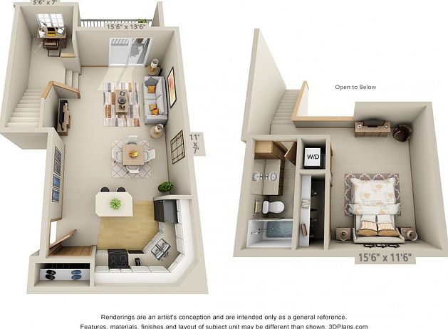 Spacious loft-style 1BR with open living area and west-facing windows for great natural light. Quiet community, washer/dryer in-unit, dishwasher, A/C and heating, and optional storage in the garage.