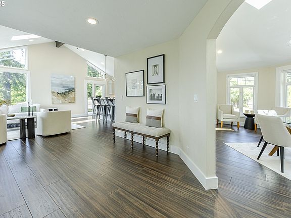 This is country living at its finest in South Eugene! Just minutes from downtown Eugene, U of O, I-5, shopping and restaurants, and perfectly situated on 1.75 acres, this beautiful home showcases sweeping views, stunning sunsets, and backs up to the Ridgeline Trail Park system for long-term privacy. The circular drive welcomes you to an open and thoughtfully updated 2610 sq ft home that blends modern amenities with a peaceful, private setting. Step inside to vaulted ceilings, expansive windows, skylights, and an open-concept layout that seamlessly connects the living, dining, and fully remodeled kitchen. A cook’s delight, the kitchen features high-end WiFi-enabled smart appliances, quartz surfaces, custom cabinetry, and a pantry. Step out to the large main-level deck — perfect for entertaining or simply taking in the views of Spencer Butte. The spacious primary suite offers a private retreat with a spa-inspired bath and its own deck, ideal for sunsets or stargazing. The main level also includes an office. On the lower level, you’ll find three additional bedrooms — two with private deck access — plus a family room with another deck to enjoy the outdoors. Additional updates include engineered bamboo wood flooring, light fixtures, hot water tank, roof with leaf filter gutter system, and a Bosch heat pump with WiFi-capable thermostat, ensuring year-round comfort. With decks on both levels, views from nearly every window, and direct access to the Ridgeline Trail, this home is truly your perfect retreat. Don’t miss out!