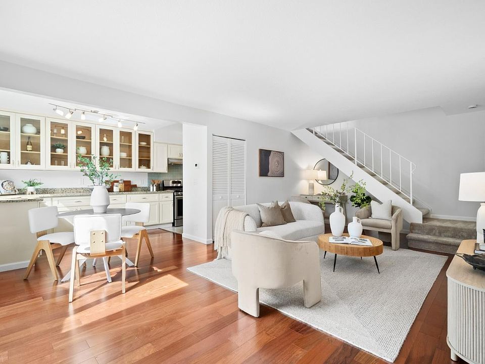 Welcome home! Charming updated 2-story townhouse blends comfort and modern elegance, balancing form and function. Open floor plan on the main level allows the living room, dining area, and the kitchen to flow seamlessly. Spacious 2 BR on the upper level - large primary suite with walk-in closet. Delightful patio provides private outdoor space. Upgrades: In-unit laundry with stack washer & dryer, dual-pane windows & sliding door, new interior doors and closet doors, copper piping and hot water circulator, new carpet, fresh interior designer paint. Assigned 1-car garage parking with nearby dedicated storage closet. Residents have access to community amenities swimming pool, clubhouse, playground. Conveniently located near top schools, restaurants and shops, Light Rail, Silicon Valley employers, and major commute routes.