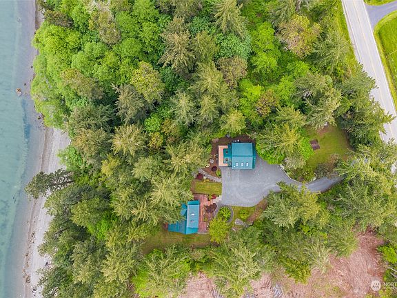 Perfect primary or vacation residence with no rental restrictions. This high bank waterfront log home with a restored expansive wrap around deck overlooking Skagit Bay, Mt Baker and sunrises. Two bedrooms in the main house, a full bath on the lower level, built-in dining nook, bar height counter, stone fireplace with gas stove insert, stairs to the loft overlooking the great room and a primary suite with a naturally lit bathroom. There is a large studio suite w/efficiency kitchen, 3/4 bath and covered view deck above detached two car garage. Includes a 1/2 bath and a studio and on demand hot water. 1.8 acre lot, has a raised bed garden, RV parking, private well, a spring and electric car charging. See remarks about steps to beach.