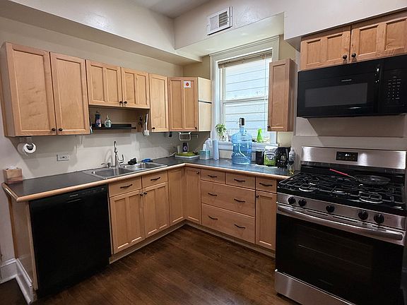 Spacious modern top floor apartment with dark stained hardwood floors throughout! Available 9/1, this unit has a queen size bedroom with huge walk in closet and smaller front bedroom with closet. Separate dining and living room. Coat closet. Updated bathroom modern and cute. Spacious kitchen with ample storage space and dishwasher. In unit washer dryer and private storage space. Storage is actually a room on same level that could be a small office. Super cute and great location on quiet street 1 block to park and Humboldt Park beach and cafe. Street parking only. Criminal Background check, credit check and proof of income required. At least 1 month security deposit and first months rent plus app fee and lease signed are required before unit is taken off the market. No evictions.