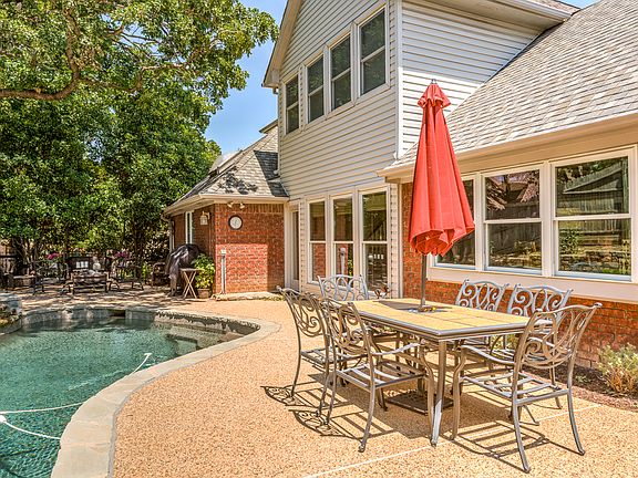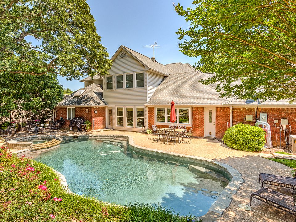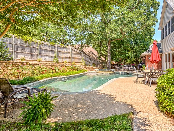 Beautiful Grapevine home tucked on quiet cul de sac street offering privacy & seclusion with 4 bedrooms, 4 full baths, 3 living areas, pool & spa on an oversized treed & landscaped lot. Great floorplan. 2 large living areas, 2 bedrooms (including master) & 3 full baths down with 2 secondary bedrooms & game room with full bath up! A flex room off the master bedroom can be used as a nursery, workout area, or study. Warm wood flooring, extensive white trim work & vaulted beamed ceilings. The private backyard has a sparkling pool & spa with a water feature & mature trees that canopy the open patio area. In desirable GCISD.