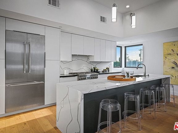 Tucked into a secluded cul-de-sac street sits this stunning new architectural view home in Los Feliz. Bold modern lines, walls of glass and high quality designer finishes envelope the voluminous space on a great street. Upon entry you're greeted with soaring ceilings and wide plank European wood floors that lead to a large bedroom/flex space that opens to a private hedged yard. Upstairs find 3 en-suites including the Primary w/spa like bathroom featuring a rainfall shower, designer porcelain tiles, a separate soaking tub and custom walk-in closet. The cook's kitchen boasts Thermador appliances including 36" range and an oversized eat-in kitchen island w/waterfall finishes that opens to the dining and living room with 15 ft long custom skylight and Fleetwood doors disappear to the large patio overlooking views of Griffith Park and the Observatory. 2 car private garage, tankless water heater, multi-zone HVAC and state of the art features. Unparalleled. Coveted Ivanhoe Elementary.