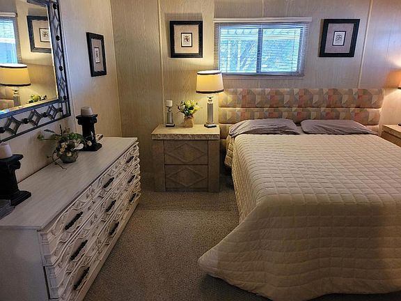 55+ Lovely home sits on large corner lot with large elevated patio to look at majestic mountains. There is parking on both sides of the house plus a one car garage. Two owners can play unlimited golf for one low monthly fee. House has been cared for and has nice furnishings. You own the land. Walk to club house. Plenty of sunlight inside and house has an open floor plan. Washer dryer are in the garage but there is also a laundry room inside.Tri Palms is in the most convenient location because it is close to Costco, Sams, Home Depot and restaurants, theaters and casinos. The Acrisure arena has world famous performers and also hosts the local hockey team.