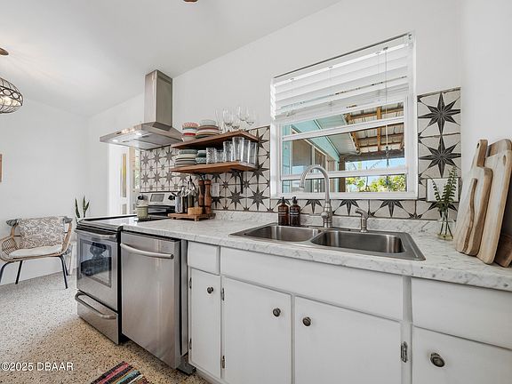 Welcome home to the most fabulous vintage house found anywhere on Daytona Beach Shores! This solid-block, two-bedroom, two-bath, freshly painted home is situated on a private cul-de-sac and is only one block from the sandy shores of Daytona Beach. It is being sold partially furnished, with unique furnishings carefully curated by the sellers to reflect the era of this home. The beautiful original terrazzo floors have been kept in pristine condition, and quality upgrades can be found throughout the house. The living room shares a small dining area that flows into the kitchen, where efficiency and quaintness are everything. The master bedroom and guestroom are well-placed right off the main living area, separated by a hallway that contains one of the two bathrooms. With plenty of closet space, these are light-filled with front & backyard garden views. The Florida room is a treasured spot, and for good reason: not only does it feature a custom-designed electric fireplace mantel, but it also looks out to the manicured lawn and tropical foliage through one of several large windows. Just outside, you will be drawn to the beautiful soaking pool and deck, as well as the covered open veranda...You will want to make this your all-season open-air room where stargazing and unsurpassed sunsets paint the sky almost every night, and all you have to do is sit back and enjoy. The backyard is fenced and runs the entire length of the property. There is an indoor laundry room that doubles as a mud room, providing easy access from the side garden. It is a perfect new remodel tailored to this fine mid-century home, featuring a beachy stone-lined shower stall and a separate toilet. With a new roof ready to be installed within the next few weeks, updated electrical (2022), A/C (2020), hurricane-impact garage door (2025), and newer appliances (2020 & 2021), this meticulously maintained classic vintage home with some modern twists is a must-see!