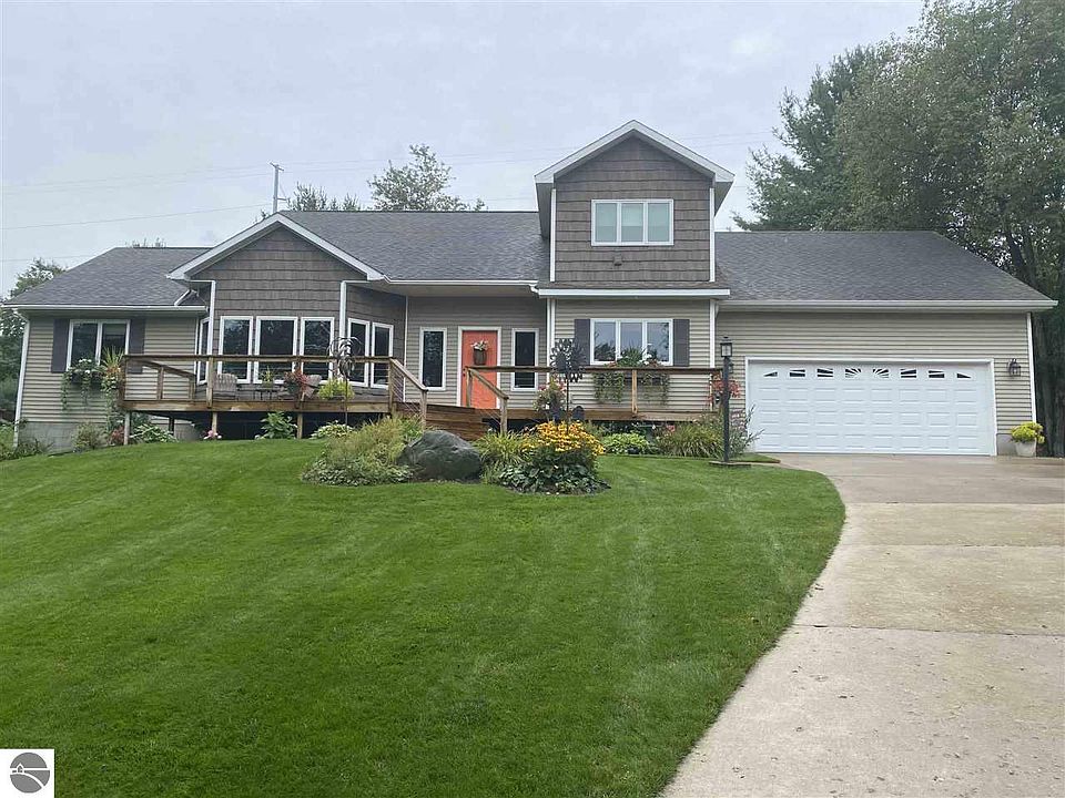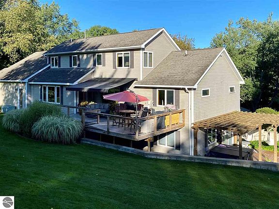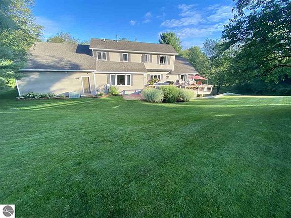 BRING YOUR FAMILY to this spacious home in a quiet, peaceful setting. You will appreciate the amenities throughout this well-maintained 5 bedroom, 3 bath home. A picture window in the living room brings in the natural light; the large dining room is enhanced by vaulted ceilings; laundry will be a breeze in the thoughtfully designed main floor laundry room; the lower level family room will be a great place for the kids to hang out with their friends with a fireplace and wet bar. Gather in the updated kitchen with newer stainless appliances, quartz countertops on the center island with bar seating, fun lighting, plenty of cabinetry and more. Relax and rejuvenate in the master bedroom suite, the master bath has a gorgeous tile shower and soaking tub, dreamy walk-in closet with built-ins, washer & dryer, folding island and the chandelier adds a bit of elegance. Plenty of outdoor entertaining space with spacious decks, electric awning on rear deck, pergola with hot tub, brick patio with built-in firepit and a luscious green lawn. Additional features include wood floors, sauna, plenty of storage, beautifully decorated, professional landscaping, 2 car attached garage, underground sprinklers, garden, pride of ownership throughout. The 30' x 40' newer pole building will be great for the handyman. The 10-acre wooded setting offers you the privacy you desire yet located just a short drive to all the amenities of Traverse City.