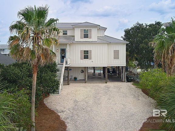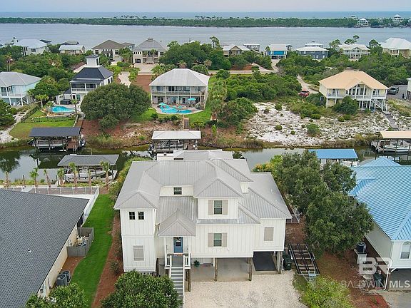 If you are looking for move-in ready on a canal front property on Ono Island - don't miss seeing this amazing home! Features include: beautiful pine floors, ship lap walls, 10' ceilings, open floor plan and an amazing kitchen with a copper farm sink and a hidden pantry! Kitchen area also features a great bar area with beautiful wood countertop, wine cooler and ice maker. The island is oversized for additional seating and a decorative hood vent adds to the charm. The dining area is off the kitchen and opens to the deck. The den is spacious and French Doors take you to a beautiful screened porch with a wood burning fireplace for cool nights and toasted marshmallows. The primary suite is on the main level. The en suite bath has an extra large tile shower, double vanity with a make-up area and connects to a large walk in closet which connects to the large laundry room which is very convenient for laundry! Upstairs you'll find three bedrooms with nice windows offering natural light and two baths. This house is also special outside! There's a 20x20 storage room that is climate controlled and ready to house all your "stuff"! Entertaining is easy around the beautiful salt water pool and with plenty of deck space for visiting and dining. A half bath by the pool means no wet feet in the house! The boat slip area is Brazilian hardwood, has a 10,000 lb boat lift with electricity and water available. It's a quick boat ride to get to big water. The yard is landscaped and a well and irrigation system are in place. Windows have impact glass. Upgrades include new front door, hurricane rated door off the dining room, HVAC upstairs is Trane installed in 2024, new pool pump and irrigation pump in 2024, most decking has been replaced with Trex. Move-in ready and waiting for you - make your appointment to see today! Buyer to verify all information deemed important. Buyer to verify all information during due diligence.