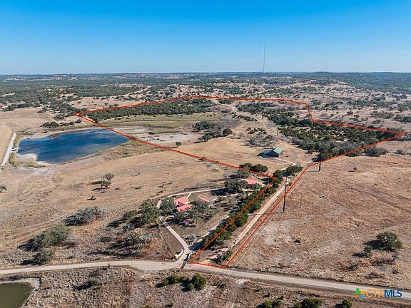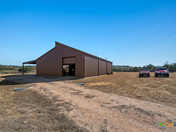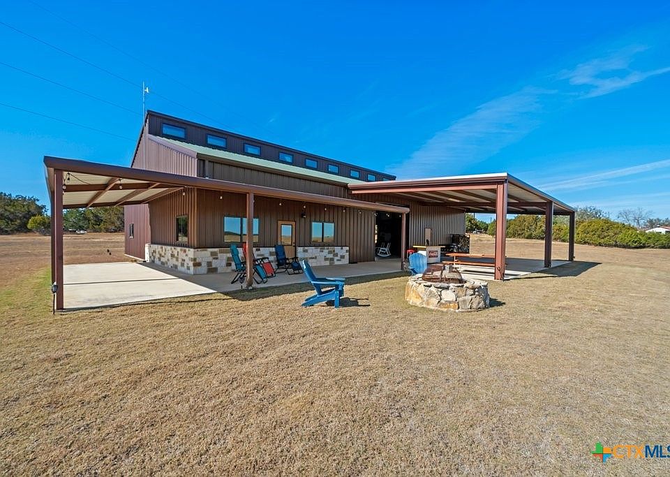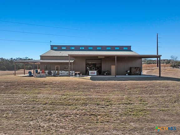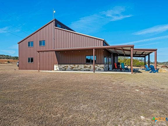 The 2-story barndo offers 4BR/2.5BA, 2,270 SF living plus a 1,250 SF wrap-around porch and fire pit. Inside, vaulted great room with reclaimed-wood plank walls, stained concrete floors and big-view windows; warm kitchen with stainless appliances, open shelving, large island and coffee bar. A walk-through closet with in-closet washer/dryer leads to the downstairs primary suite. Upstairs, the loft includes 3 bedrooms, a full bath, great closets, and tons of storage while sleeping many family and guests—overlooking the great room while keeping guests private. Custom stair/railing adds safety. Attached 2,339 SF party-barn/garage is double-insulated with a 20' peak, 9 celestial (skylight) windows, two oversized doors, built-in bar, pool table, arcade stations, half bath and abundant storage; more room for toys. Plus a 600 SF caliche-based pole barn, and dock. Improvements include an on-site well, sprinkler system, septic, water heater, water softener and 2 HVAC; double-pane windows and 6" insulation in the living space. For the hunter: prime habitat for whitetail, turkey, dove, quail & hogs,plus the area is known for free-ranging axis deer. Just 25 min to Fredericksburg, 10 min to Garrison Brothers Distillery, and 20 min to lunch at Red Bud Café in Blanco making this retreat perfectly positioned for cherished memories.