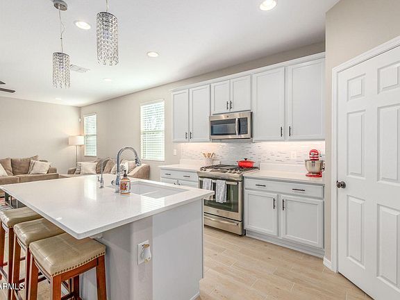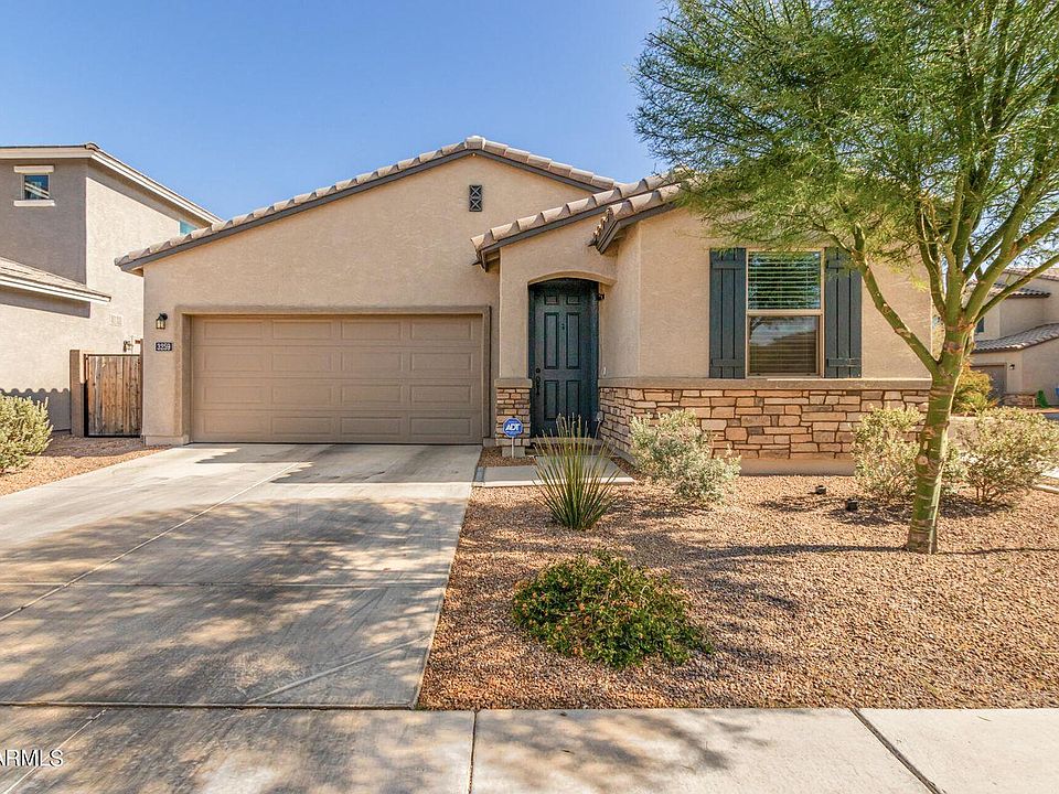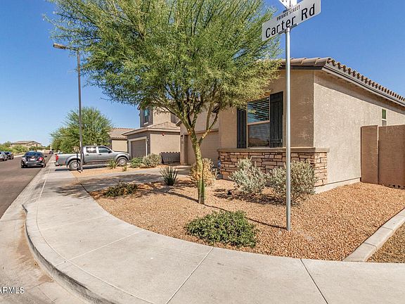 Excellent CORNER lot home in a GATED COMMUNITY. Spacious layout, 3 bedrooms, 2 baths, 2 car garage. As you enter the home, you will be greeted with an open concept floor plan, neutral two tone paint, beautiful wood look tiles, carpets in bedrooms. Stunning kitchen features stainless steel appliances, 42'' white cabinets, quartz countertops, walk-in pantry, and kitchen island! Spacious master bedroom with large walk-in closet, and bathroom w/double sinks and barn door enclosure. Entertainers yard with extended patio, outdoor pool table stays! Artificial turf, pavers and beautiful water feature. HUGE community has parks, play grounds, Ramadas and picnic tables, BBQ grills, and a large area for recreation. Quick access to schools, shopping, freeways, fridge,washer/dryer included, move in ready! First Month's Rent plus Security Deposit Due at Lease Signing. Non-Refundable Cleaning Fee Due to Move In. Renter responsible for all utilities. No smoking allowed. Small pets permitted up to 25 lbs. Tenants must abide by all HOA Rules and Regulations within community.