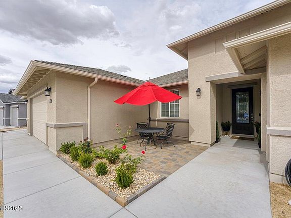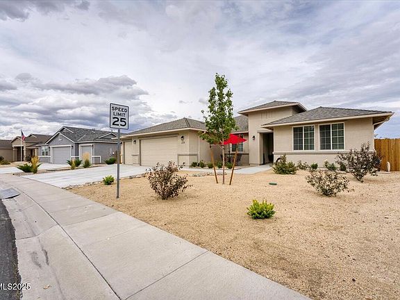 Backing up to the tee green at Hole #2 of The Desert Lakes Golf Club in Fernley and built in 2023, this spectacular single-story has it all. Step inside and discover a generous open-concept floor plan, where a sprawling living area with plush carpet flows seamlessly into the vinyl plank flooring of the kitchen and dining area. A thoughtfully-designed kitchen boasts an oversized center island, state-of-the-art stainless steel appliances, granite countertops, a walk-in pantry, and abundance of chic white cabinetry. The primary suite is highlighted by a spa-like bathroom with a luxurious soaking tub, glass-enclosed shower, dual sinks, and spacious walk-in closet. Three additional bedrooms provide excellent space for a variety of functions. The front entrance bedroom is a complete suite with private entry and full bath. Outside, enjoy a fully-fenced yard with a covered patio and low maintenance xeriscaping, offering you a tranquil place to make memories and unwind. The property also features a three-car garage, designated laundry room, ceiling fans throughout the home, and more. With marvelous modern finishes and plenty of space for both entertaining and day-to-day living, this one won't last long. Don't miss the opportunity to make this home yours!