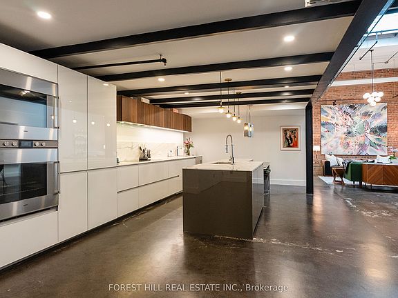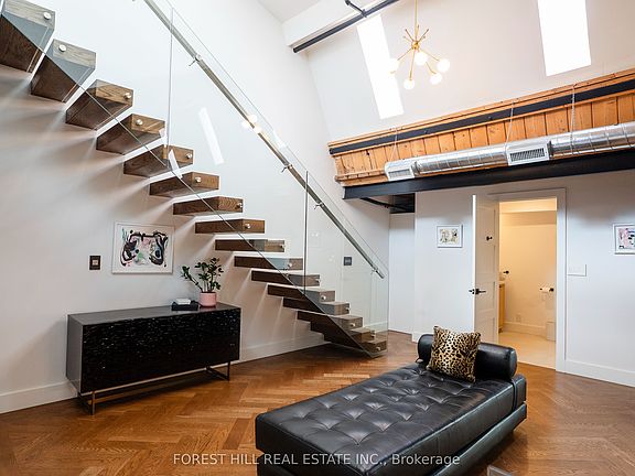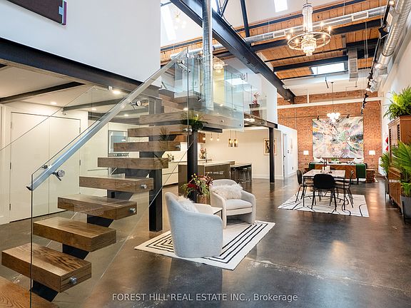 Welcome to The Gallery, a rare three-level designer loft offering over 2,500 sq.ft of interior space and a 375 sq ft rooftop terrace. This residence embodies refined urban sophistication with 26-foot ceilings, exposed brick, polished concrete floors, and gallery lighting. The Ernestomeda kitchen, with more than $150,000 in upgrades, features Gaggenau and Miele appliances, Calacatta marble, a bar sink and wine fridge. The main level showcases a Kelly Wearstler marble mosaic bathroom, combining artful design with luxurious finishes. A floating oak staircase leads to the mezzanine primary suite with herringbone floors, double sinks, and a marble walk-in shower. The private rooftop retreat offers high-end composite decking, multiple seating areas, and a custom dining table suspended over a skylight. Set in the heart of Leslieville, just one block from the new Ontario Line subway, The Gallery defines contemporary Toronto living. NOTE: The property is currently assessed as both residential and commercial. If the new owner occupies the property solely as a residence (without operating a business), the property taxes would be reduced accordingly.