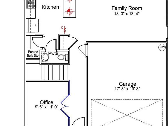 The entryway of this 4 bedroom, 2.5 bathroom home opens into a office space. Just past it, the kitchen leads to a walk-in pantry and the family room. Upstairs, a laundry room and a full bathroom are conveniently located near the three spare bedrooms. The primary bedroom is connected to its primary bathroom and walk-in linen and clothes closets.