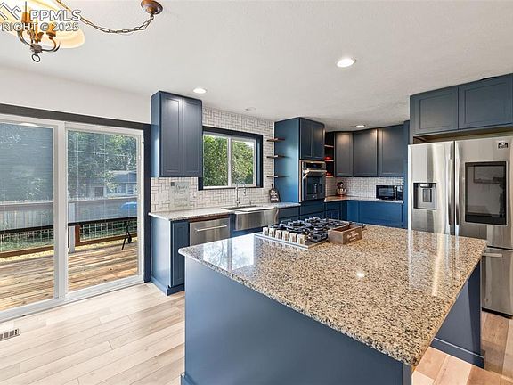 Welcome to this beautifully updated ranch-style home, offering the perfect blend of modern design, comfort, and convenience. Step inside to find walnut hardwood flooring throughout most of the main level, enhanced by abundant natural light and a bright open floor plan. At the heart of the home sits a true chef’s kitchen featuring high-end appliances, granite counters, a stylish tile backsplash, a farmhouse apron sink, and vinyl plank flooring. The oversized island with built-in gas cooktop is complemented by deep inset spice drawers, soft-close cabinetry, and ample storage, making both cooking and entertaining a delight. The spacious living and dining areas provide plenty of room for gathering, while the slider door with built-in blinds leads to a large backyard deck, perfect for BBQs, outdoor dining, or simply enjoying Colorado sunsets. Three bedrooms on the main level share a beautifully updated bath, while the finished basement expands your living options with a large family room anchored by a cozy wood-burning fireplace, a massive fourth bedroom with a walk-in closet, and an additional bathroom. Practical upgrades include a new roof (2022), newer systems, and a loft area in the garage that adds excellent storage alongside a built-in workbench. The generous backyard offers space to relax, garden, or entertain year-round. Additional highlights include recessed lighting, upgraded baseboards, and thoughtful design choices throughout that make this home truly stand out. Location is ideal, just five minutes from Fort Carson’s Gate 20, one block from the middle school, and close to the river walking trails, parks, and everyday amenities. This meticulously maintained home combines thoughtful upgrades, modern style, and unbeatable convenience. Don’t miss your chance to make it yours!