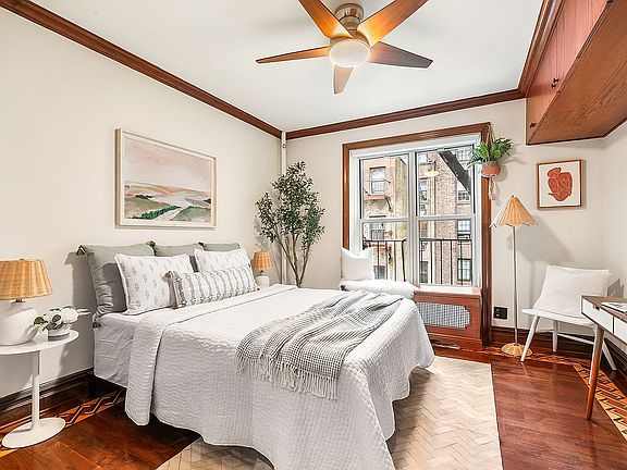 The sunny bedroom overlooks leafy trees, has an oversized window, ceiling fan, more overhead built-ins and large closet. It can easily fit a king or queen size bed, desk and additional furniture.