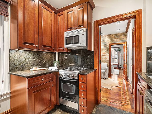 The home has been renovated with incredible attention to detail including abundant built-ins, inlaid flooring, solid wood doors, crown mouldings and exposed brick adding character and warmth. The windowed kitchen boasts modern appliances, granite counters and ample cabinet space.