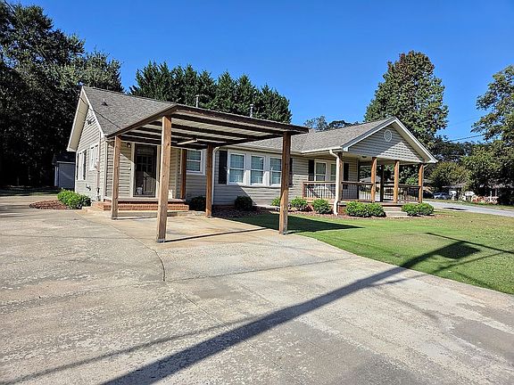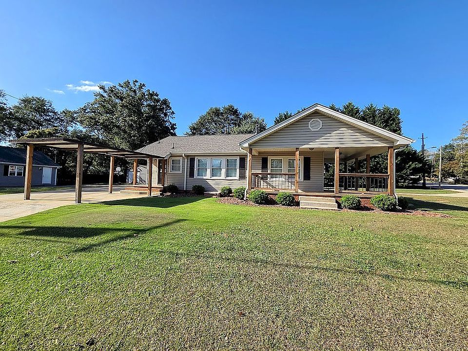 Welcome to this charming home located at 326 Katherine Street, Easley, SC, just a block away from Haygood Park and close to downtown Easley. This large corner lot property boasts a concrete circular driveway, adding a touch of elegance and convenience along with detached double carport and utility building. Inside, you'll find a home that seamlessly blends modern with classic charm. The kitchen is equipped with a refrigerator, stove, dishwasher, and microwave, all complemented by stunning granite countertops. The home also features separate laundry room with washer and dryer connections for your convenience. The formal dining room with gas fireplace and built in shelving is perfect for hosting dinner parties or enjoying a quiet meal. The living room is a cozy retreat with a custom rock fireplace and gas logs, perfect for those chilly evenings. The refinished real hardwood flooring adds a touch of warmth and elegance throughout the home. Each room is fitted with a ceiling fan for added comfort. Experience the perfect blend of convenience and charm in this home.