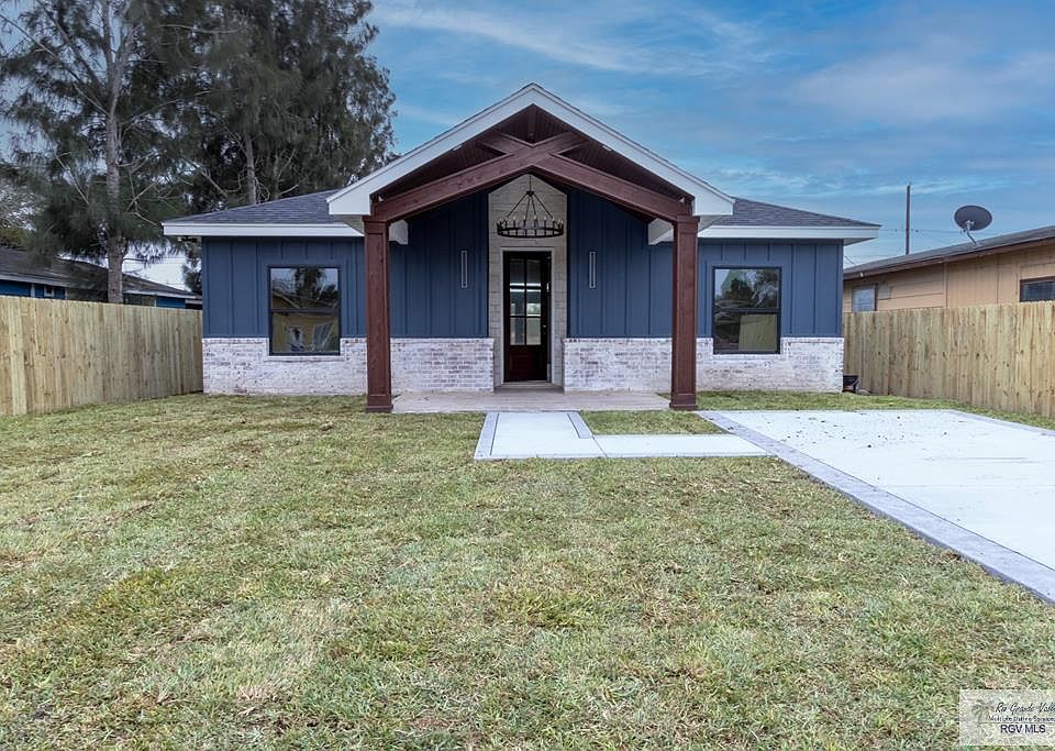 0% Down Payment. Beautiful one-of-a-kind ranch-style home with custom unique finishes, an oversized high covered back patio, and a spacious lot with front and rear entry. To get there: from FM 506 north, turn right on Los Fresnos St after the railroad track and post office, then right on 11th St, and left on La Rucia Ave.