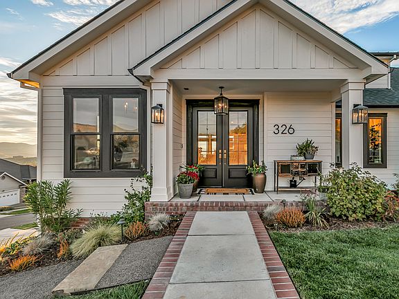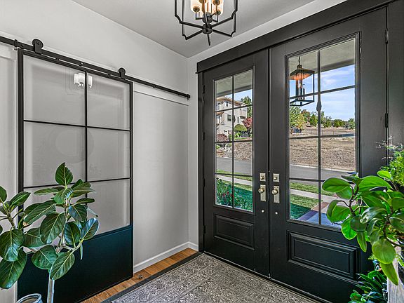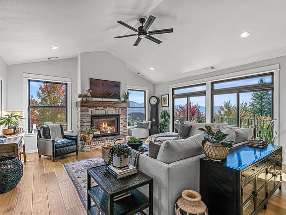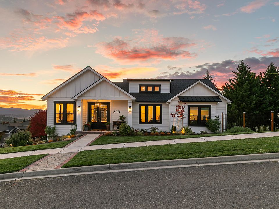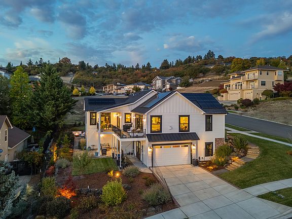 Perched above the valley in desirable East Medford, this stunning home showcases modern design, tasteful finishes & sweeping views. The open-concept layout features tall ceilings & expansive windows, creating a bright & welcoming atmosphere. The spacious great room connects to the kitchen & dining area, highlighted by quartz countertops, a butler's pantry & access to a large composite deck for enjoying the views. The primary suite is conveniently located on the main level, with a spa-like bathroom featuring a tiled shower, large soaking tub & walk-in closet. A 2nd bedroom & dedicated office space are also conveniently located on the main level. Downstairs, 2 additional bedrooms and a second living area with a built-in wet bar offer flexibility for everyone. Thoughtful touches continue with solar panels, an EV charger in the oversized two-car garage & well-established landscaping. Modern sophistication meets timeless charm — the perfect blend of comfort, design, & breathtaking views.