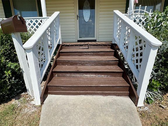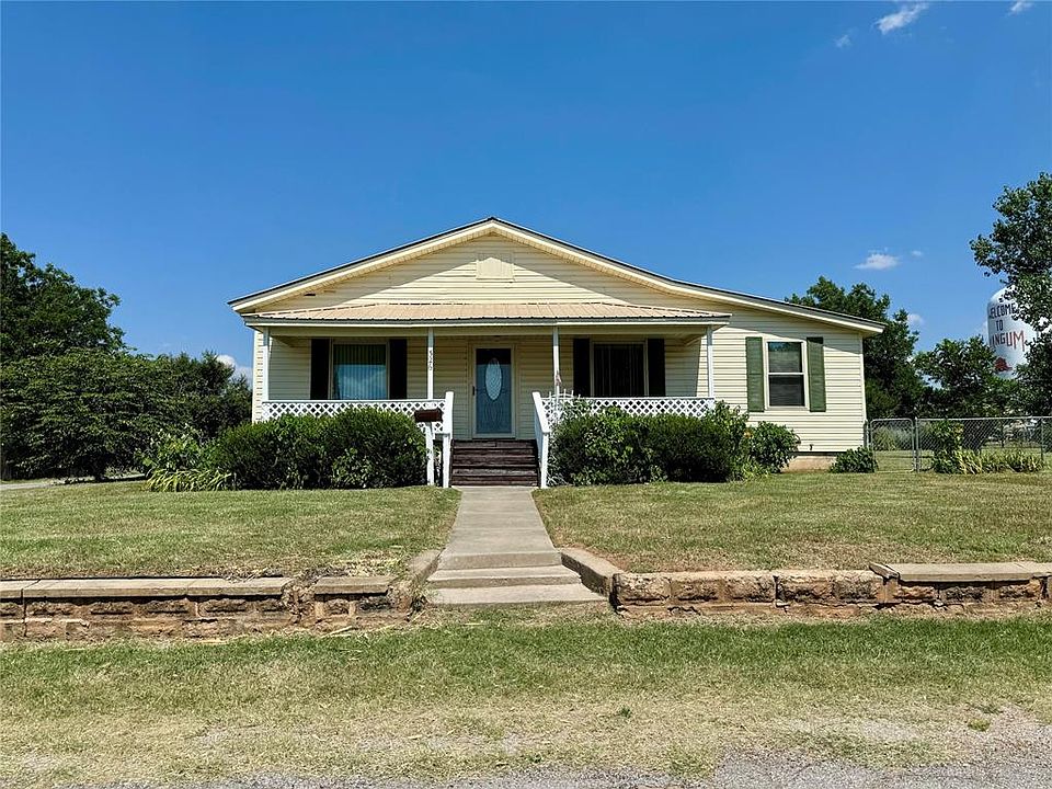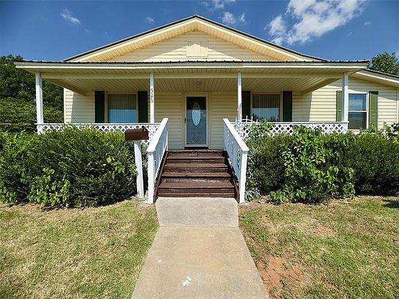 Talk about CURB APPEAL !!!! Whether it's sitting on your covered front porch drinking your morning coffee or sitting on the back deck admiring the backyard oasis, you will appreciate this property and everything it has to offer. It is perfectly situated on a corner lot with two additional, oversized lots with lush greenery, colorful flowers and mature fruit trees.  With added security, this home is surrounded by a full chain link fence with a single and double gate, a covered carport with blacktop parking and an underground storm cellar for extra protection and peace of mind during the inclement weather. On the property is an additional outbuilding with a half bath, gas hookup for heat, a window unit for cooling and offers plenty of opportunity to store your belongings or tinker around with hobbies. This quaint home offers 1693sf, 2 bedrooms with a bonus room, 2 full baths, 2 living rooms, 2 dining rooms, central heat and air, vinyl siding, a newer metal roof, newer energy efficient windows throughout, a large pantry, tons of kitchen cabinets and storage galore.