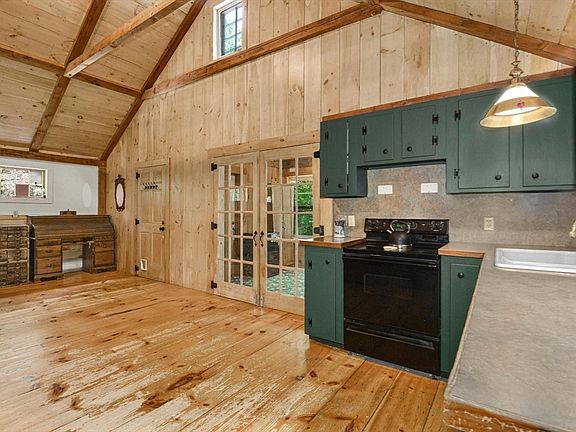 Welcome Home to "THE BARN" This Charming 1999 Custom Designed Farmhouse! Get ready to be wow'd as you enter, see the soaring 16 foot high cathedral timber-frame style beamed living room ceiling! Fantastic open floor plan! There are beautiful wide pine floors, stain-glass windows, farm-style lighting sprinkled thru-out this cozy, modern well-built home! French doors lead to the sunny dining room with vaulted ceiling to gather with family and friends. The first floor hallway leads to the two bedrooms both with closet, carpet, "barn" features. The 2018 remodeled bathroom w/dual sink*granite-topped vanity*mirror*soaking tub*low-flow toilet*tile floors*linen closet. Upstairs is a cozy loft space over-looking the living room that is currently used as the 3rd bedroom, makes a great office/den. Downstairs to the large basement ready for your finishing touch, ideas! Convenient one-car garage is wired for a generator. Private FENCED flat backyard w/mature landscape to relax, garden and enjoy!