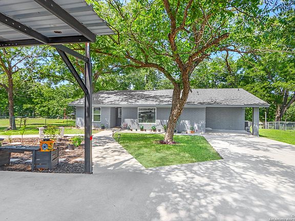 Waterfront Living on Lake Placid! This beautifully remodeled single story, 3-bedroom, 2-bath home, sits on a peaceful 3/4-acre lot with 88 feet of prime waterfront along the Guadalupe River / Lake Placid in McQueeney. Enjoy stunning views from the spacious covered back porch, concrete slab with Gazebo, the sunken fire pit area, or from anywhere on the lush, shaded yard featuring plenty of mature pecan and cypress trees. Inside, the home boasts an open, bright floor plan with a large open living area, 2 dining areas, granite countertops in kitchen and bathrooms, breakfast bar, and a bay window in the kitchen that brings in lots of natural light. The primary bedroom offers double doors with breathtaking river view and outdoor access. Spacious laundry room with lots of cabinets / storage space. Ceiling fans in every room, updated vinyl and laminate flooring, and modern finishes throughout complete the home. All Septic plumbing replaced, maintained and pumped within the last year. The property includes 3-car carport, attic storage, a huge concrete slab approx. 57' X 19' in front of the home with a storage shed; slab can be used for additional parking, perfect for RV with hookups or a even a guest house potential. With a gentle slope to the water, the backyard is fully usable; it is partially fenced with a double gate for easy river access. Located in a quiet cul-de-sac with minimal traffic, this home is move-in ready and offers tranquility, privacy, and endless possibilities. With dam repairs slated to be complete by August/September 2025, come make this your ideal waterfront retreat for years to come! No HOA.