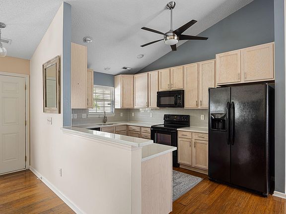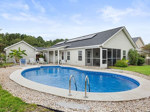 Welcome to this charming one-story retreat! Step inside to find bamboo floors and a vaulted ceiling that create a warm, airy feel, filled with natural light. Enjoy morning coffee on the screened porch overlooking lush landscaping and serene pond views. The backyard is designed for entertaining and unwinding with a paver patio, tropical plantings, and plenty of space to lounge poolside. Kitchen boasts beautiful quartz countertops and abundant cabinetry. The private primary suite offers dual closets, a spa-like bath with soaking tub, walk-in shower, dual sink vanity, and linen closet. Plus cozy screened porch access just steps away. Two additional bedrooms share a hall bath. In the backyard you'll find mature landscaping peaceful pond views and an in-ground saltwater pool perfect forrelaxing or entertaining. Backyard is fully fenced. A detached garage, plus an 8x12 shed, provide great storage and flexibility. New roof and HVAC in 2024. Solar panels provide monthly costs savings. Located in a welcoming neighborhood with its own pool and clubhouse, and with multiple entrances for easy access to local conveniences, this home offers the privacy you want and the amenities you'll love.