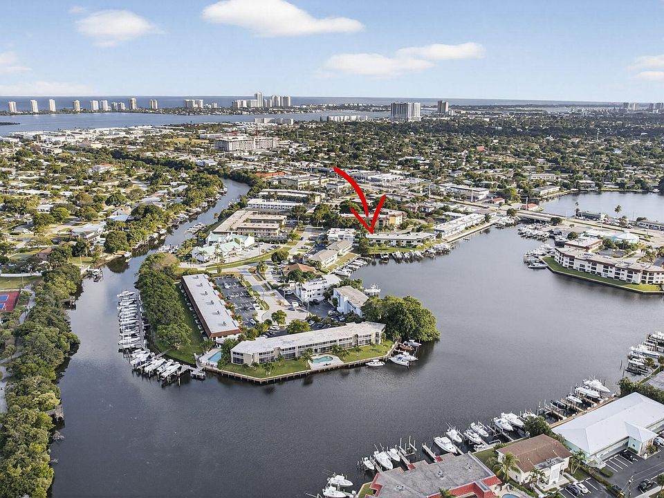 Surprisingly spacious condo with lagoon water view and private assigned boat dock with 16,000 lb lift. Updated kitchen, newer white appliances, Stacked washer, dryer in utility closet. Good size bedrooms each with a bath. Primary bedroom has walk in closet, updated bath. Lovely lanai has plexiglass windows and screens offering waterviews of serene lagoon and overlooking the boat dock. Condo roof 2 years old, fresh exterior paint, new landscaping, newly paved parking lot. Accordian shutters on windows and lanai. Dock with boat lift currently has a 30Ft boat can hold larger. Water and electric at dock. Coveted North Palm Beach location, close to restaurants, shopping, beaches, NPB Golf course.