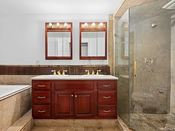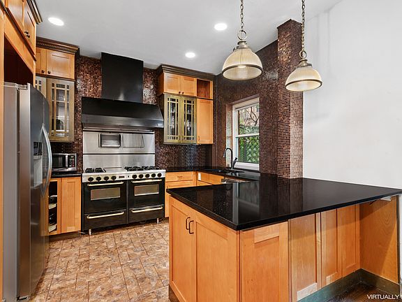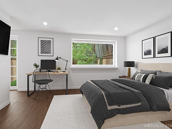 Downstairs, a staircase leads to two oversized king bedrooms and two full bathrooms.The rear bedroom offers tons of closet space, a stunning garden view and private outdoor access, while the front bedroom features another decorative fireplace and generous closet space.