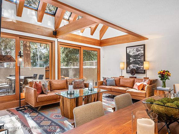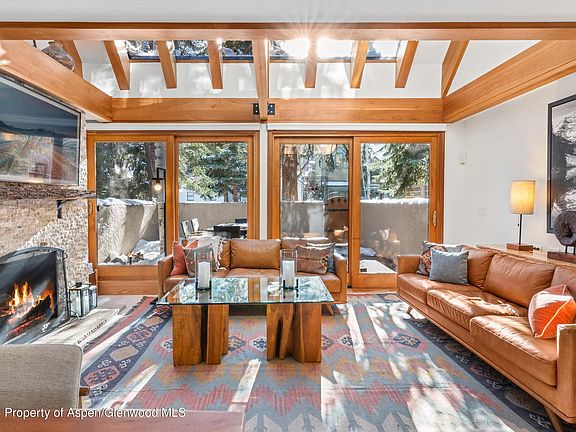 Beautifully remodeled townhome is perfectly situated just a few blocks from downtown Aspen. Nestled on a quiet, residential biking street, it provides easy access to all that Aspen has to offer while maintaining a peaceful, serene setting. The home's high ceilings, skylights, and south-facing windows create a bright, airy atmosphere, while the wood-burning fireplace adds warmth and charm to the living space. Gourmet kitchen features stainless steel appliances, breakfast bar with seating for four, adjoining dining area with seating for six and flows seamlessly into the living area with Aspen Mountain views. Step outside to the private courtyard, which is designed for seamless outdoor living with dining, seating, and a grill - perfect for enjoying Aspen's fresh mountain air. The spacious primary suite offers a king bed, sitting area, two closets, and en suite bathroom with shower. The top level enjoys two guest suites: one with a king bed and another with a split king, offering flexibility for guests. The shared bathroom on this level features a shower with a tub and two vanities for added convenience. The combination of the prime location, clean mountain contemporary finishes, and new furnishings set this home apart as an exceptional choice for those seeking comfort, style, and the best of Aspen living. Additional Amenities: One-Car Carport, Patio with Grill, In-Unit Washer and Dryer